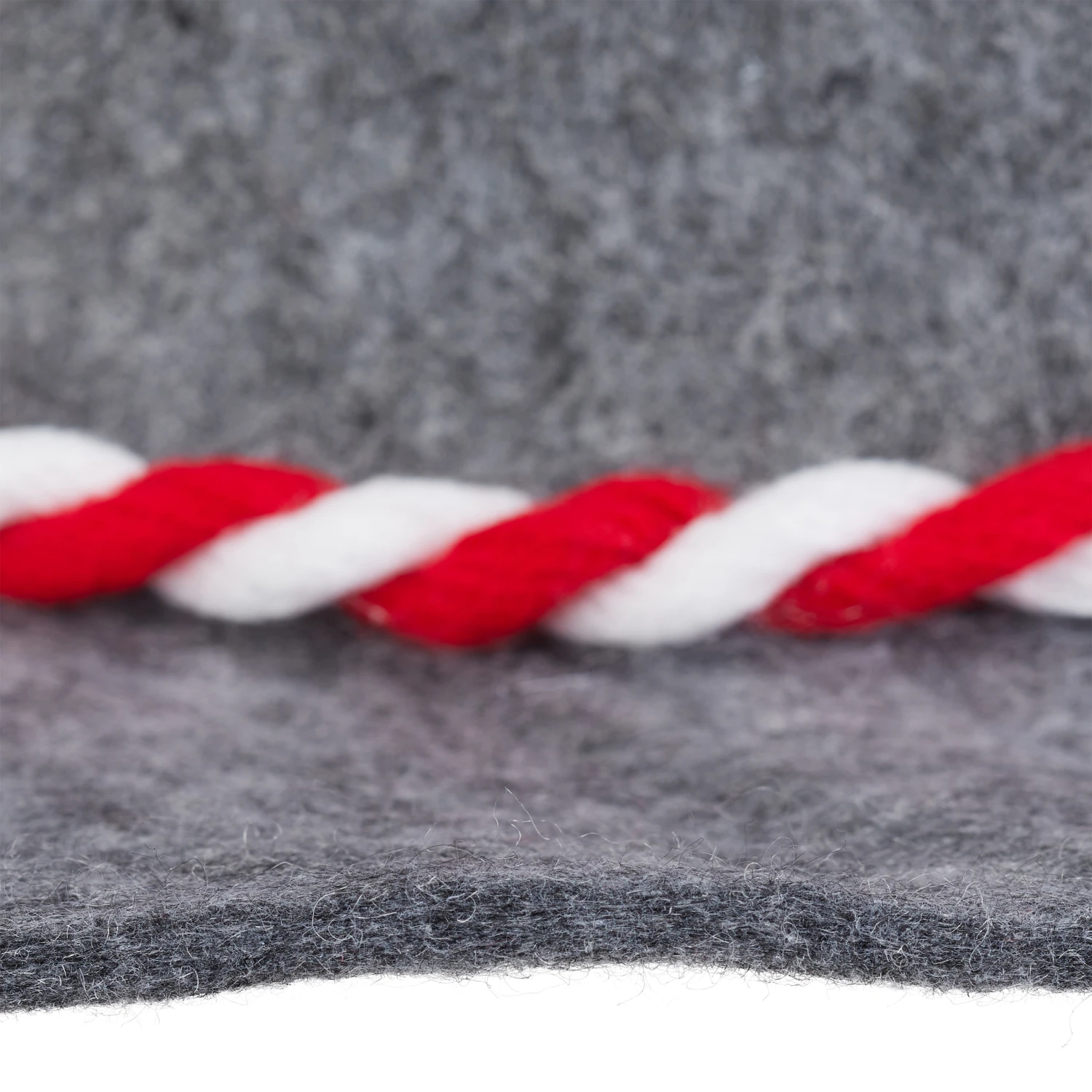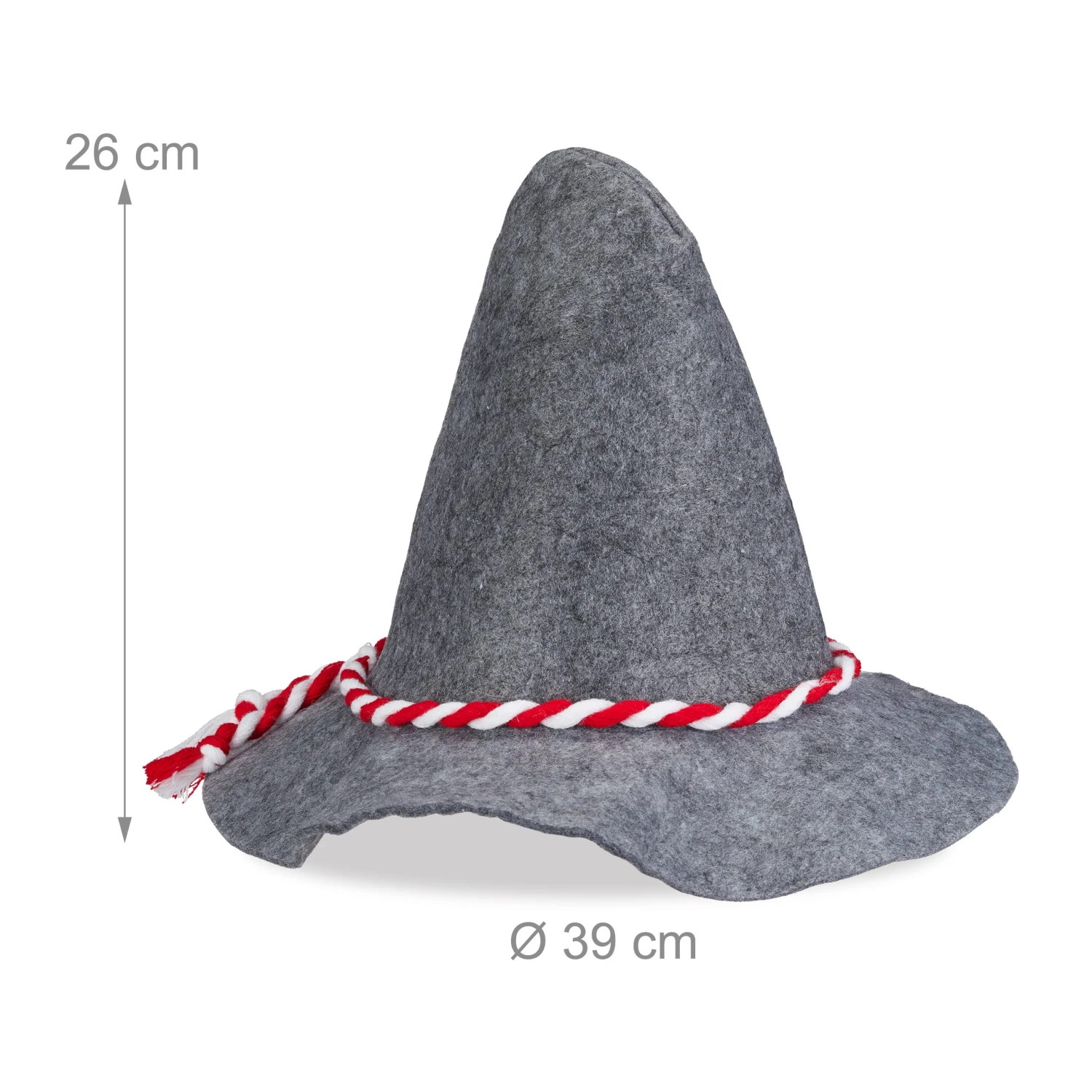 Dieser traditionelle Seppelhut darf bei Ihrem nächsten bayerischen Auftritt nicht fehlen. Mit dem Wiesenhut haben Sie genau das richtige Accessoire zur Hand, um zu einem echten Hingucker beim Karneval, Fasching oder Mottoparty zu werden. Die umlaufende Kordel in Rot und Weiß ist dabei ein besonderer Eyecatcher des ansonsten in Grau gehaltenen Filzhuts. Der Hut kommt in Einheitsgröße daher – Fesche Madln können sich mit dem Bayernhut ebenso sehen lassen wie zünftige Burschen in traditioneller Tracht.