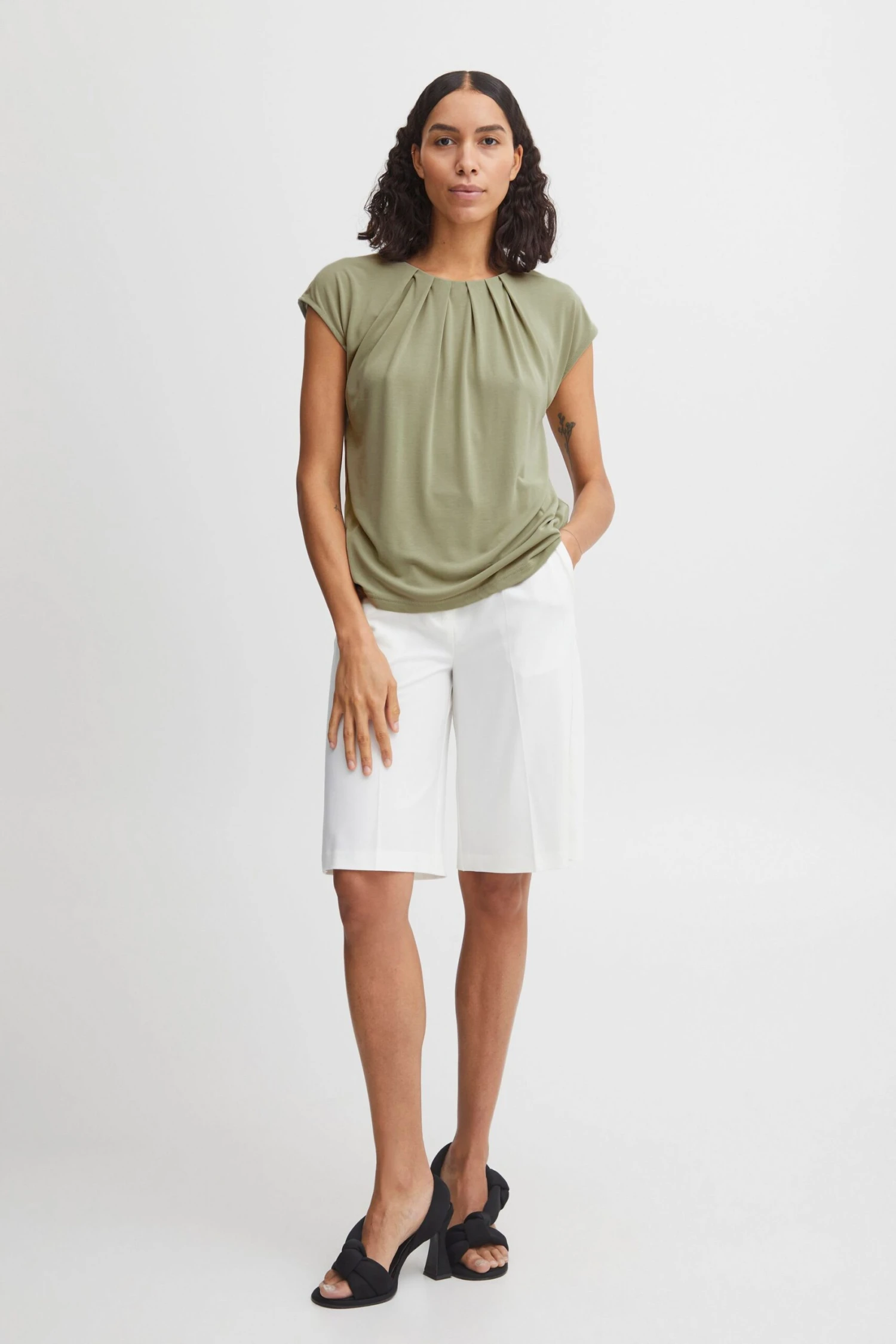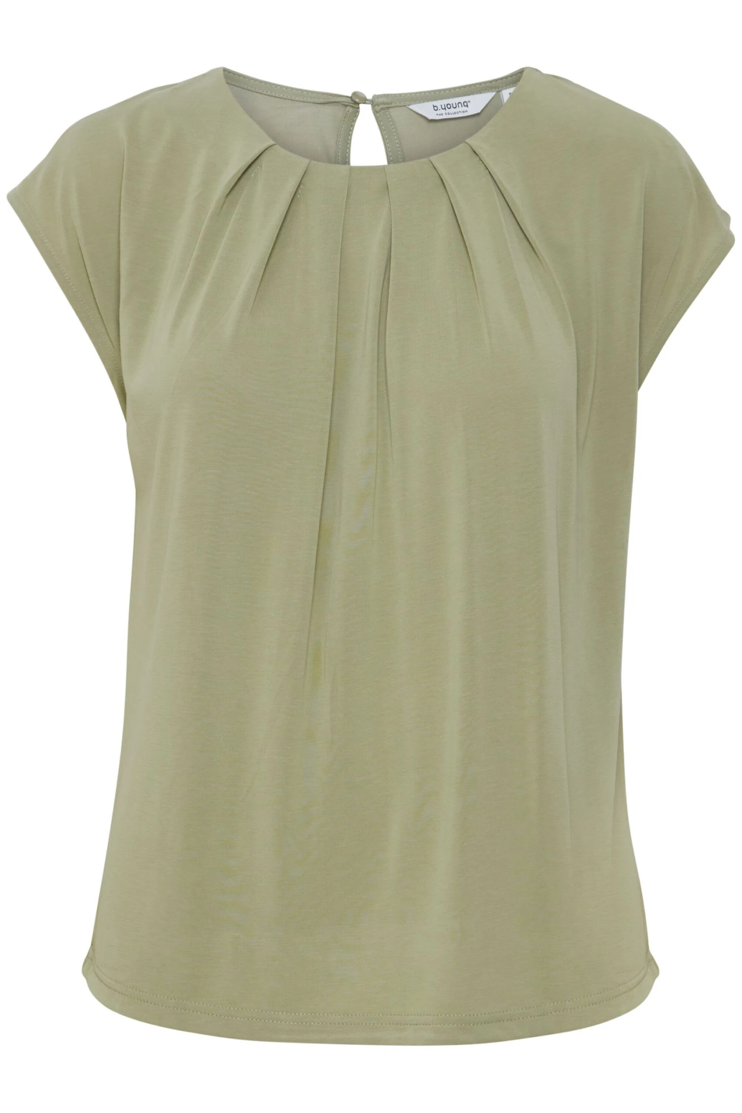 DETAILS & HIGHLIGHTS: T-Shirt mit kurzen Ärmeln, Rundhals-Ausschnitt mit Falten-Details, Knopf und Schlüsselloch hinten, lockerer Schnitt