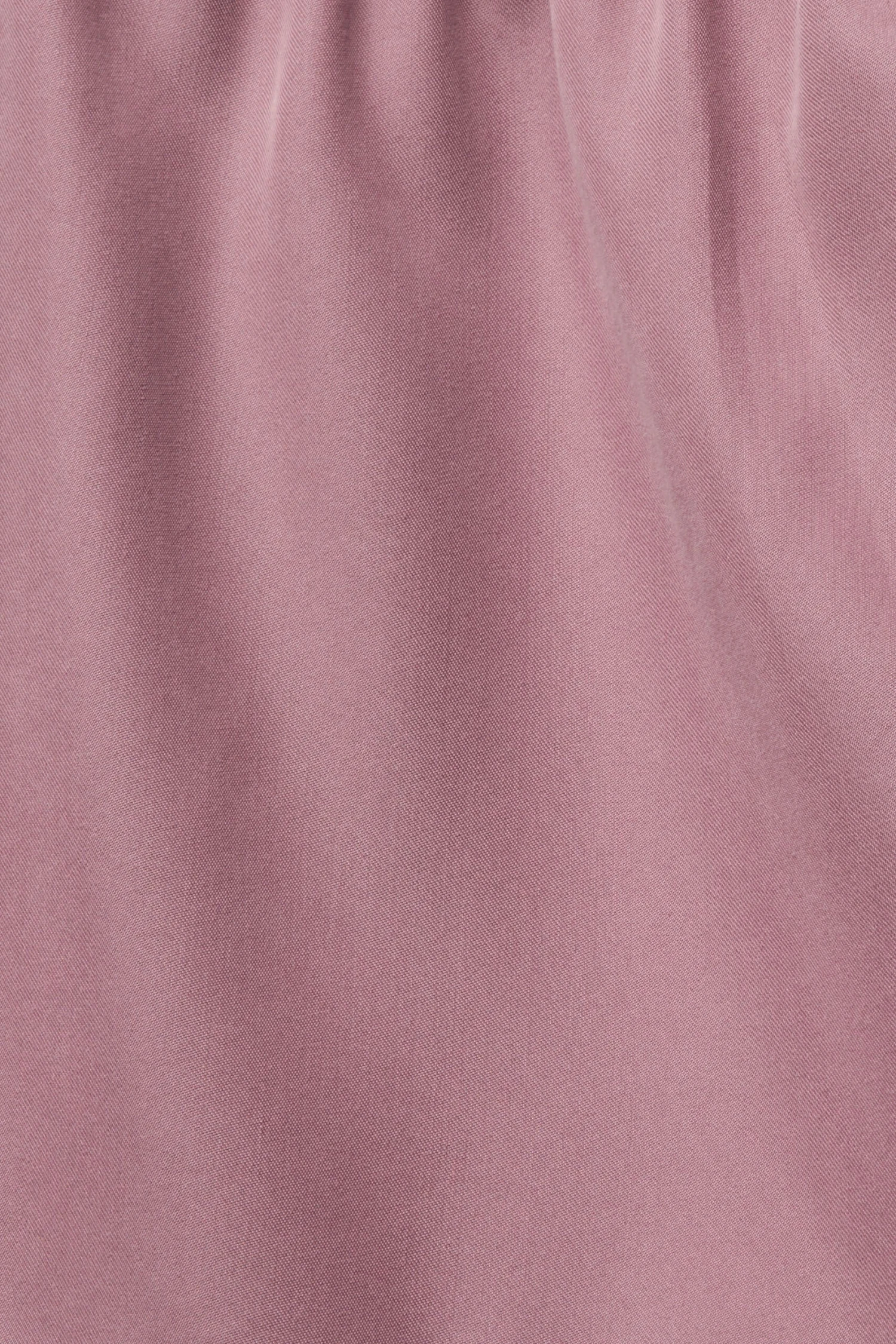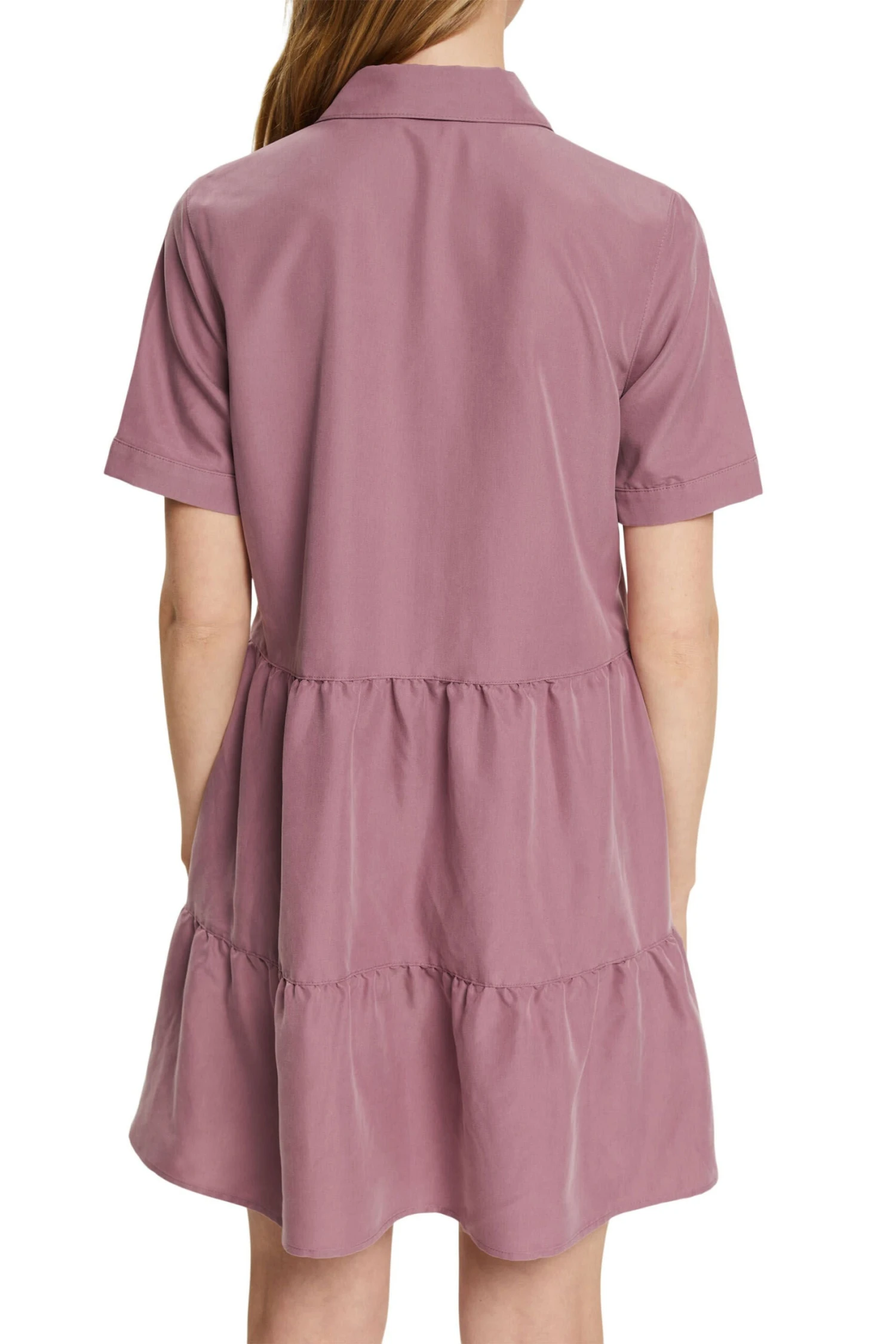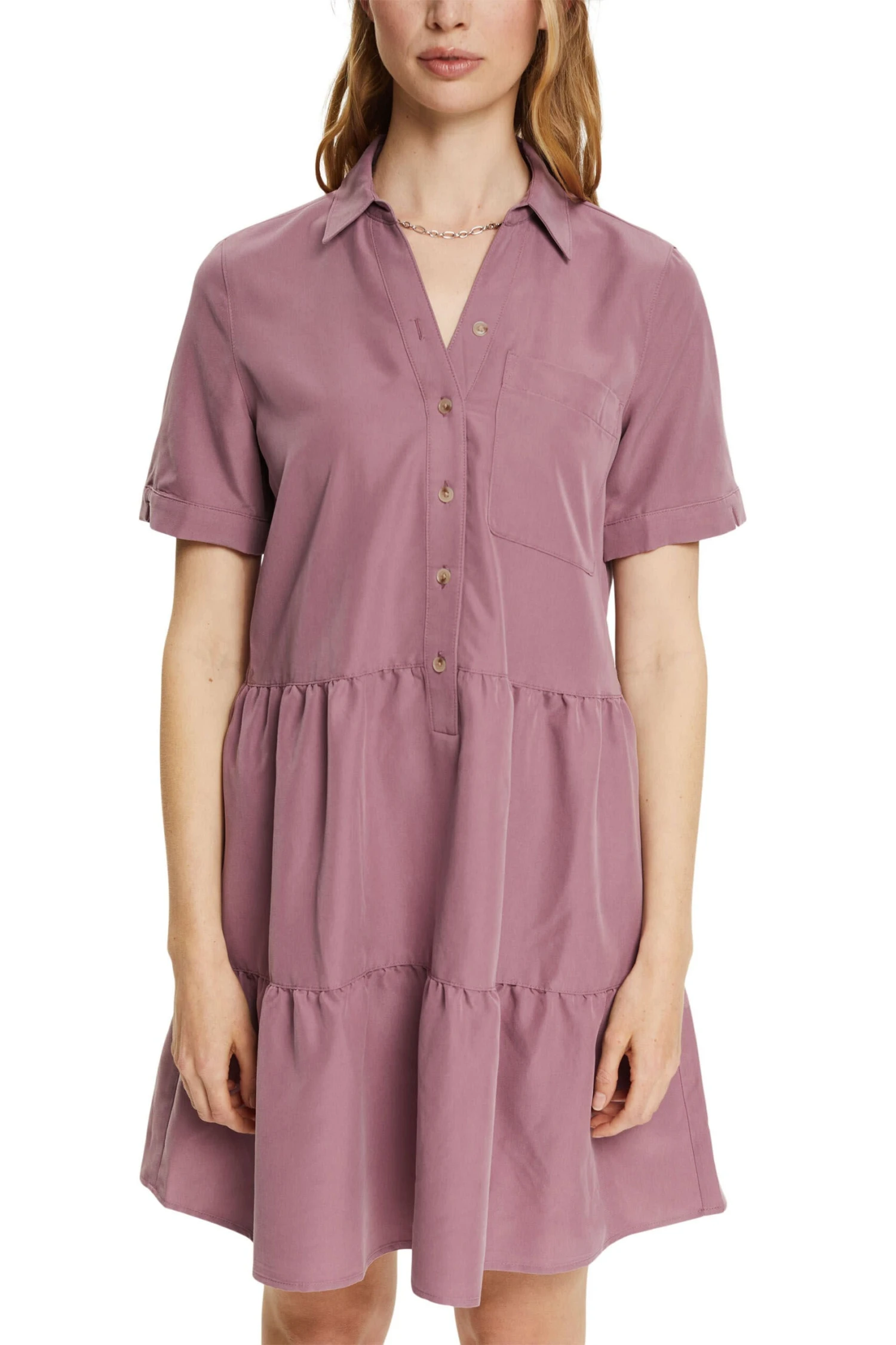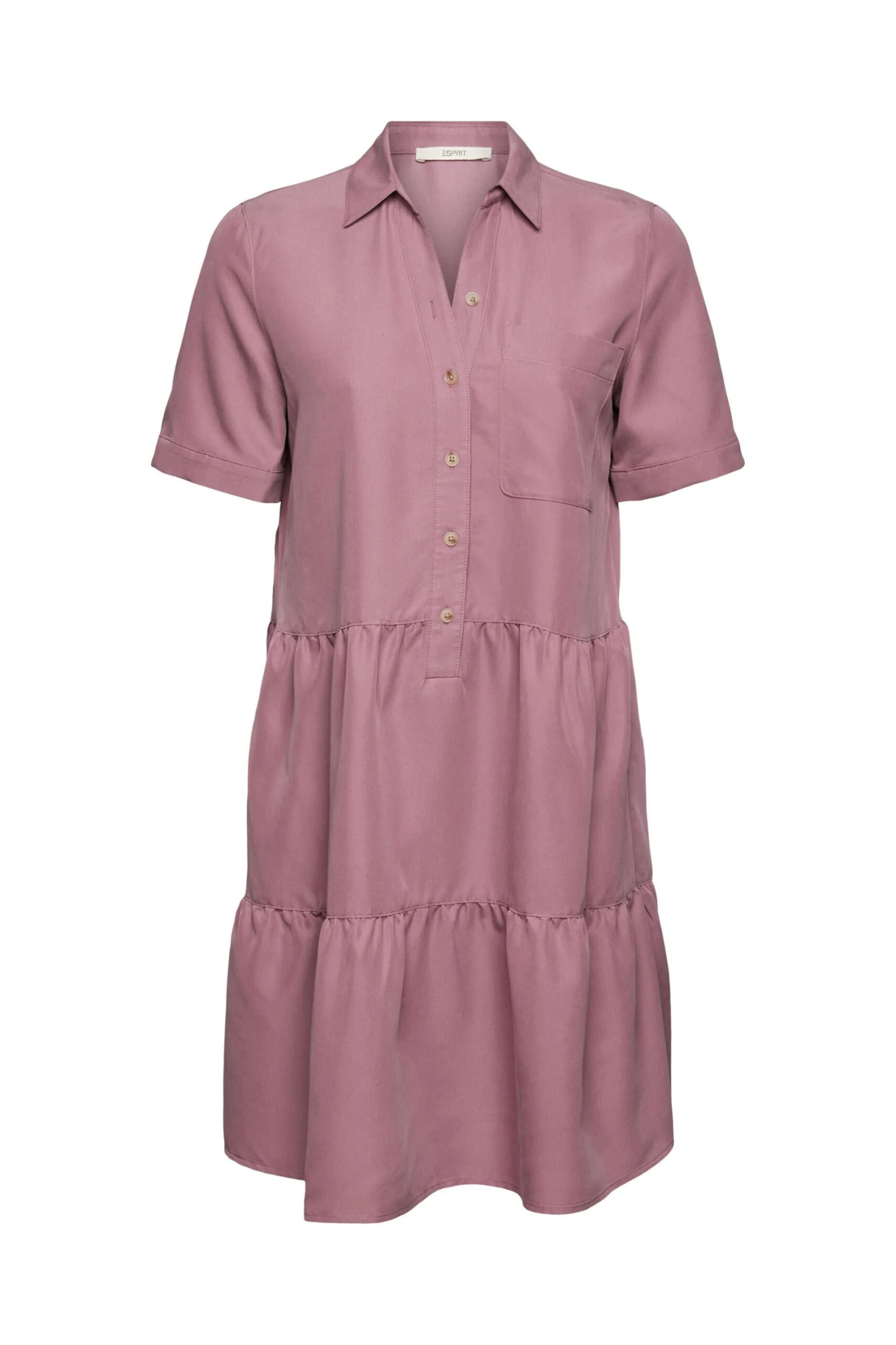* Webstoff mit weichem Griff * Umlegekragen * Knopfleiste bis zur Taille * Eine aufgesetzte Brusttasche * Kleine Schlitze am Ärmelsaum * Abgestufte Volants * Ausgestellte A-Linie in Midilänge Pflegehinweise: 30°C Pflegeleicht, Nicht bleichen, Nicht im Wäschetrockner trocknen, Mäßig heiß bügeln, Nicht trockenreinigen