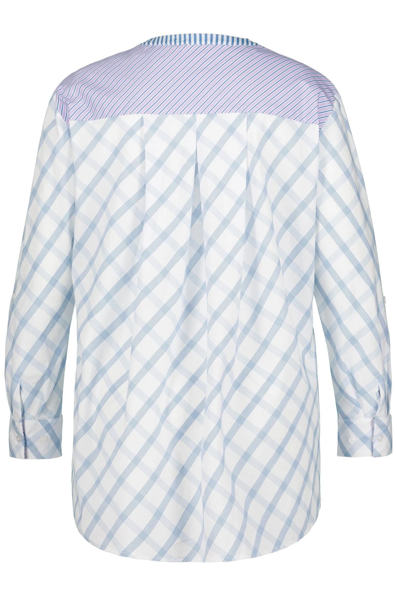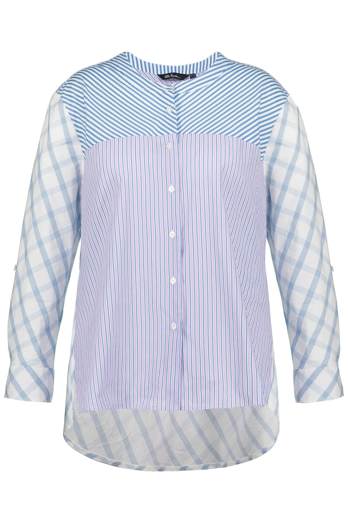 Streifenbluse, oversized, mit modischem Streifenmix. Kleiner Stehkragen, gerundeter Saum, hinten länger. Langarm mit Manschetten und Krempelriegel für 3/4-Länge.